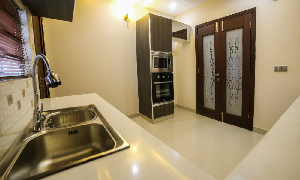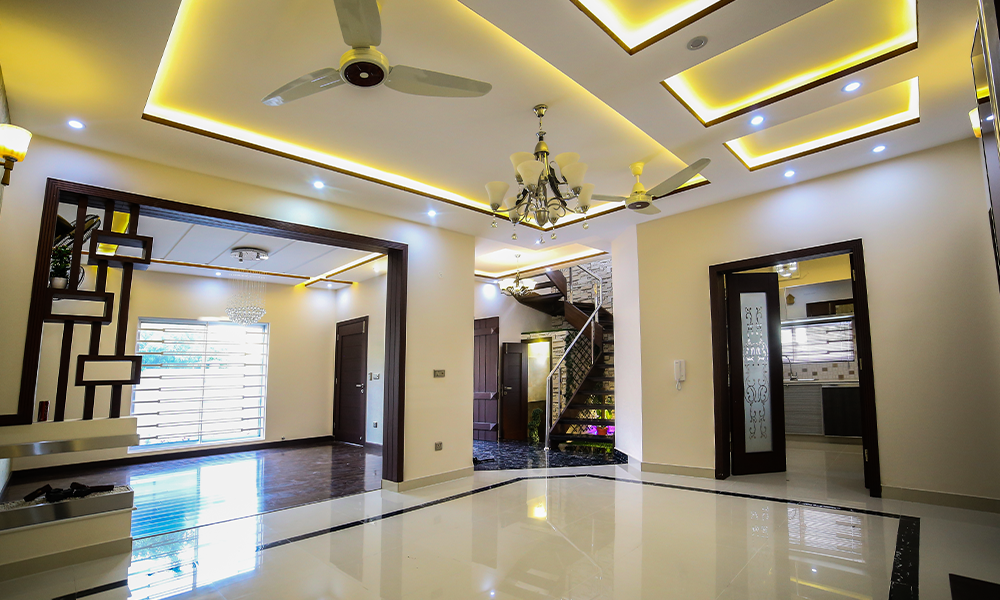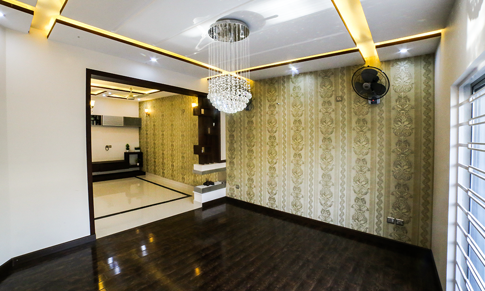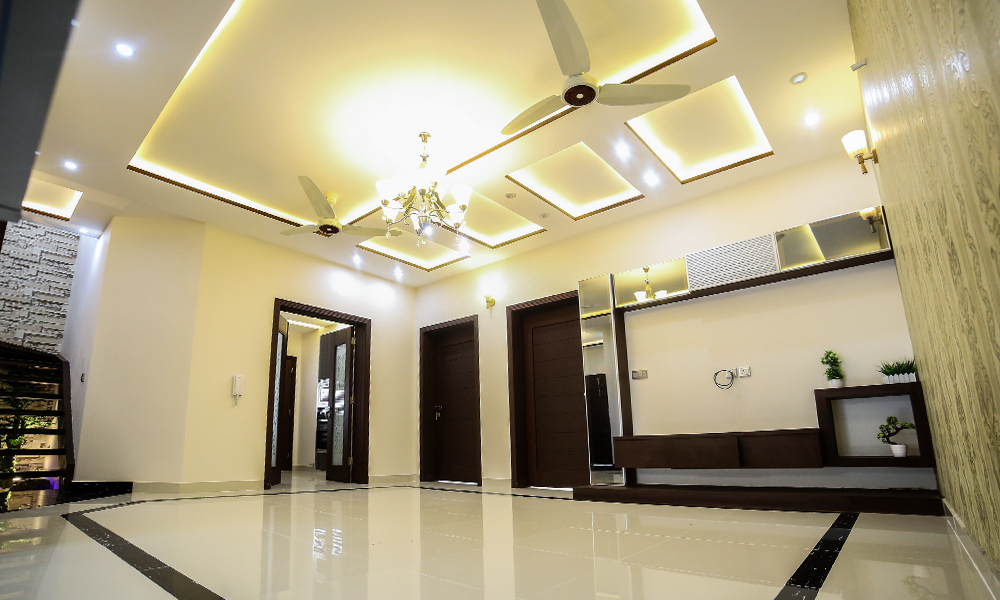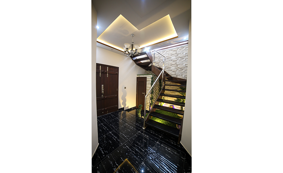 10 marla house in one of the most prestigious residential blocks of Bahria town Sector B. Project was completely designed by the experts of Team Overc’s and construction from grey structure till finishing was also carried out under the expert supervision of Team Overc’s. Grey structure was constructed 100% according to the technical standards and no compromise in quality of structure was done to save or cut the cost of house. Finishing of house was planned and executed under A or premium grade/category. Interior was designed in such a way that residents should get a class act and master piece in comfort.